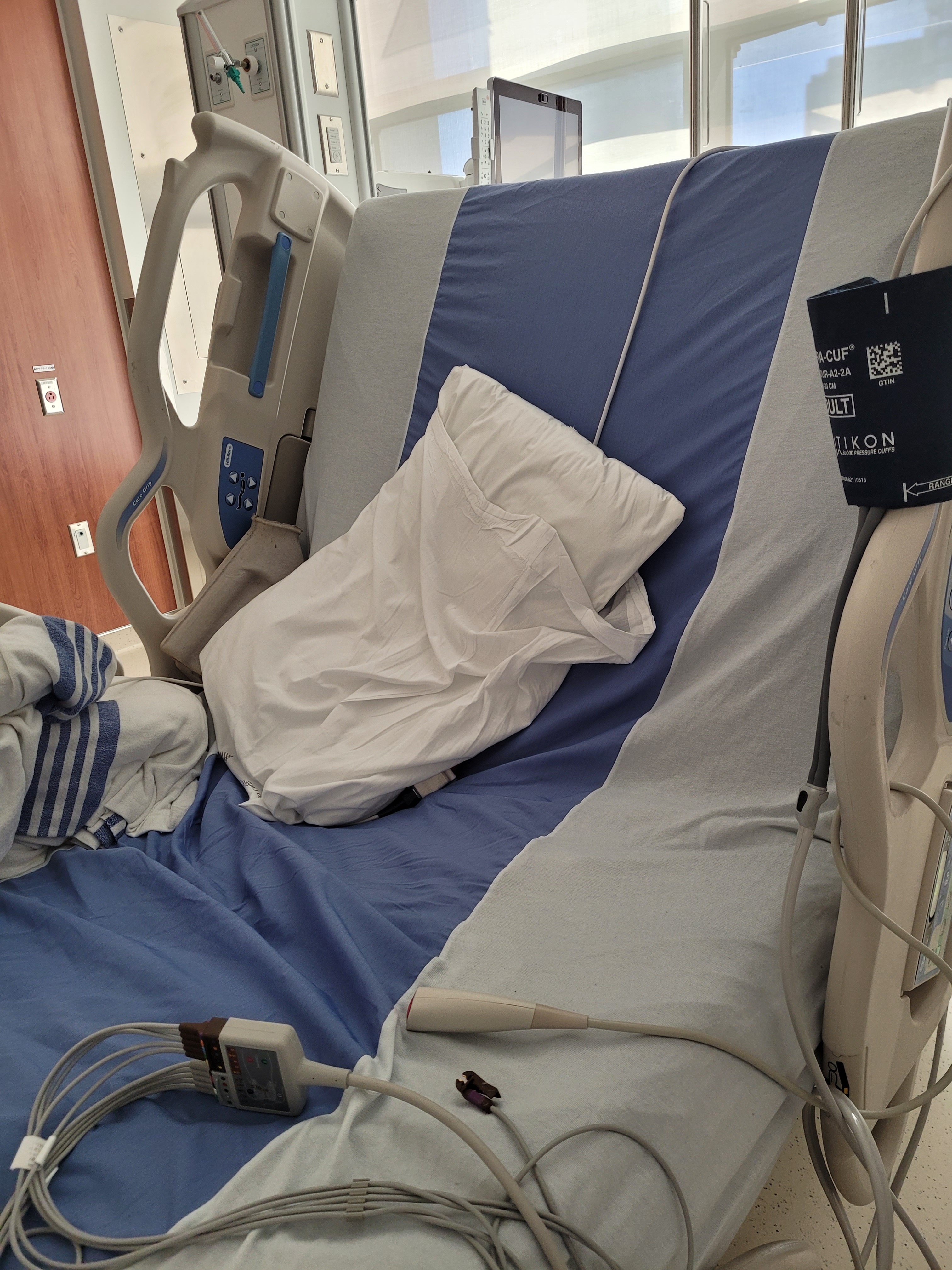 When you’re in ICU, with too many damned wires attached to your torso, and an oxygen monitor on your finger, getting out of bed is an impossibility.