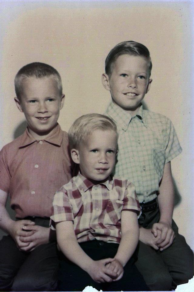 Me and my brothers are seated at the kitchen table. I think it’s Friday night, because we always had beans and wieners for dinner on Fridays.