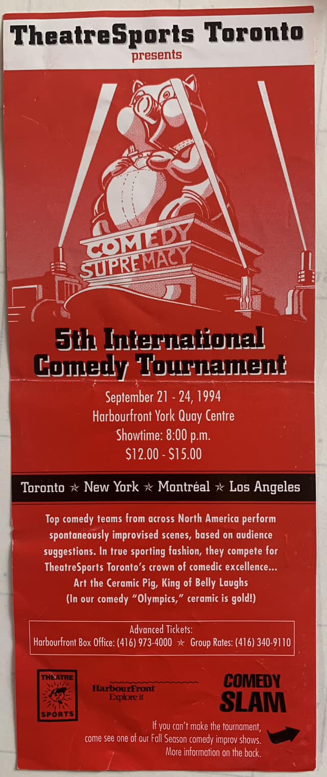 It’s amazing how much I’d forgotten until I saw this flyer posted on Facebook by my friend Chris Hayward. This was the year I’d met Joe (from the NY TheatreSports team) and we became instant friends (after being so sure we already knew each other). He extended an invite to jam with their troupe if and when I visited the Five Boroughs. I went the following spring (or late winter, I remember it was cold) and while they were between seasons on stage, I sat in on a workshop where I learned the Coming Attractions game that I brought back to Toronto.